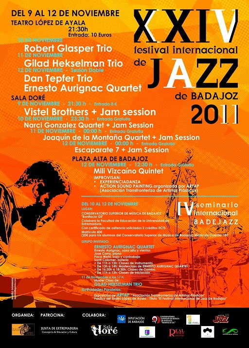 - 21:30h, Teatro López de Ayala, entrada: 10€. ROBERT GLASPER TRIO ![]() - 23:30h, Sala Doré, entrada gratuita. Narciso González Quartet + Jam Session Viernes, 11 de Noviembre de 2011 - 21:30h, Teatro López de Ayala, entrada: 10€. GILAD HEKSELMAN TRIO ![]() Joaquín de la Montaña Quartet + Jam Session Sábado, 12 de Noviembre de 2011
